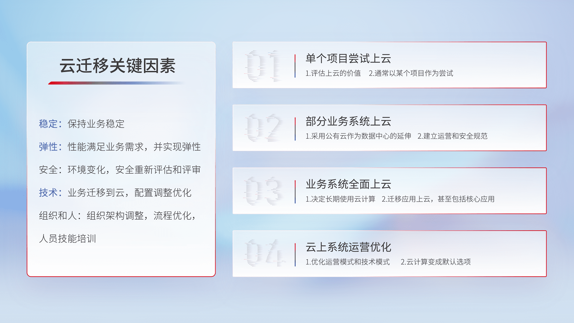 结合实际业务,,,,从规划设计、、、、云平台选型、、、、云原生改造、、、、数据迁移、、集成交付,,,迁移全过程为客户识别最佳上云路径,,,做好风险识别管理,,设计网络架构、、、身份权限、、、、安全审计合规、、操作审计、、日志审计、、监控告警策略、、、、多站点容灾设计等,,对云上基础设施进行整体规划,,,提升IT治理水平,,,,以满足弹性、、、高可用、、、高性能的需求。。。